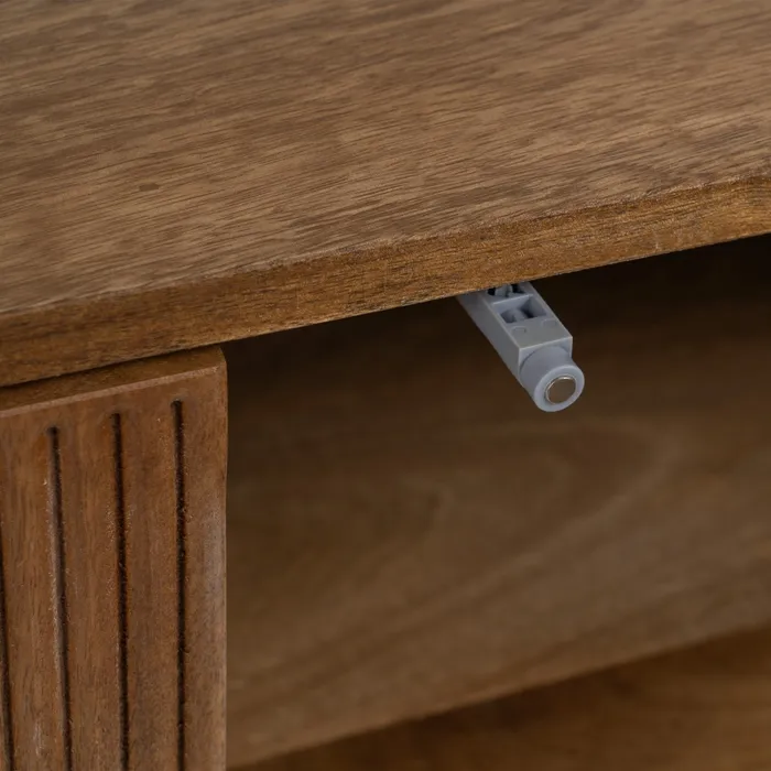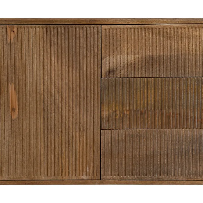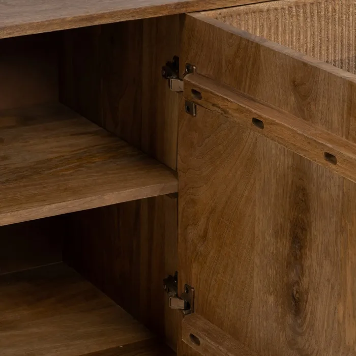 Aparador fabricado en madera de mango macizo, trasera e interiores de los cajones en DM. Este tipo de mueble es funcional, elegante y busca una conexión con materiales naturales, manteniéndose atemporal y versátil para distintos tipos de interiores. Diseño y estilo para tu hogar. Cuenta con dos puertas y cuatro huecos y tres cajones, con frentes de puertas y cajones , con original diseño y patas cónicas.