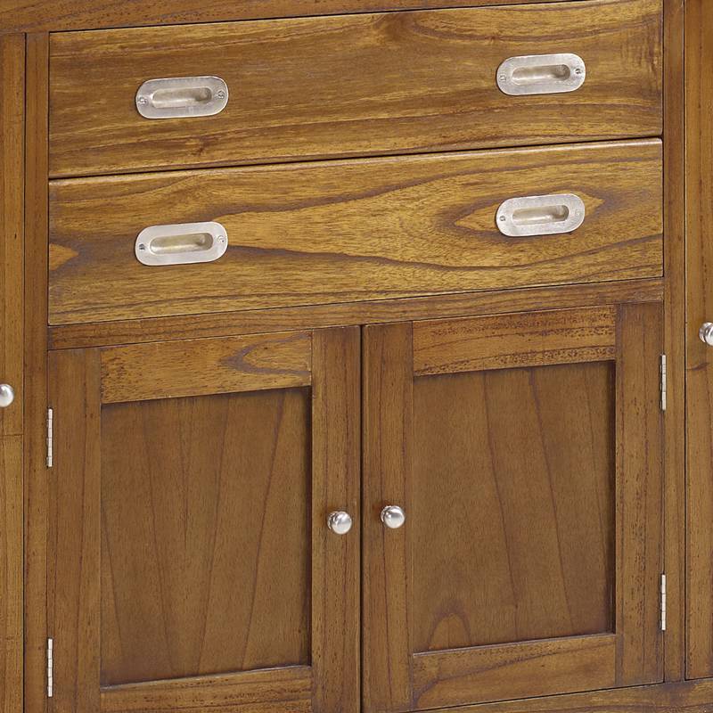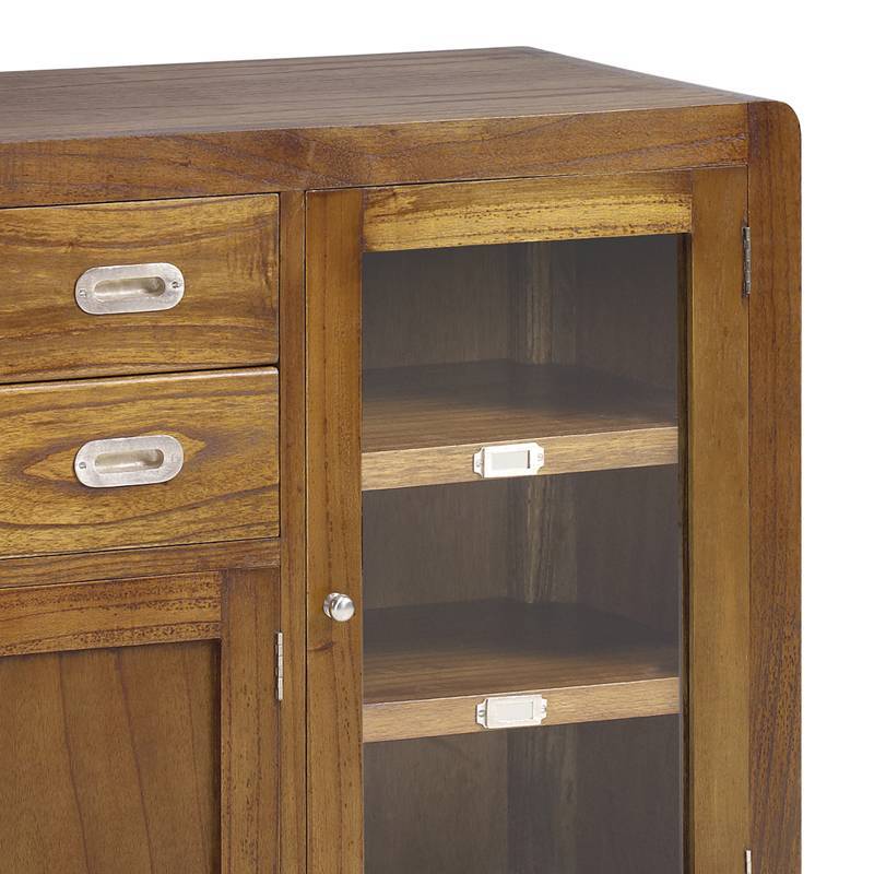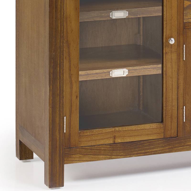 Cajones con guías de madera y ensamblados con cola de milano, tirador de aluminio, traseras y fondos de cajones en tablero de con 2 puertas de cristal, 2 puertas de madera y 2 cajones.