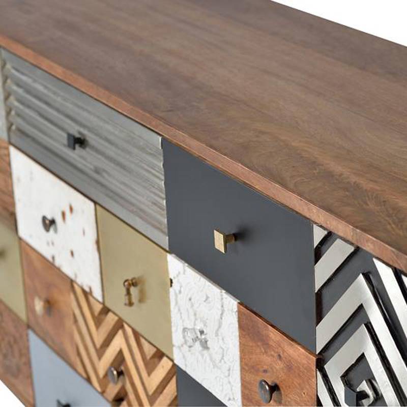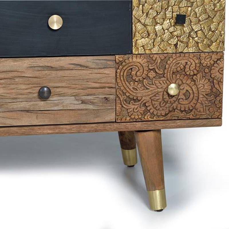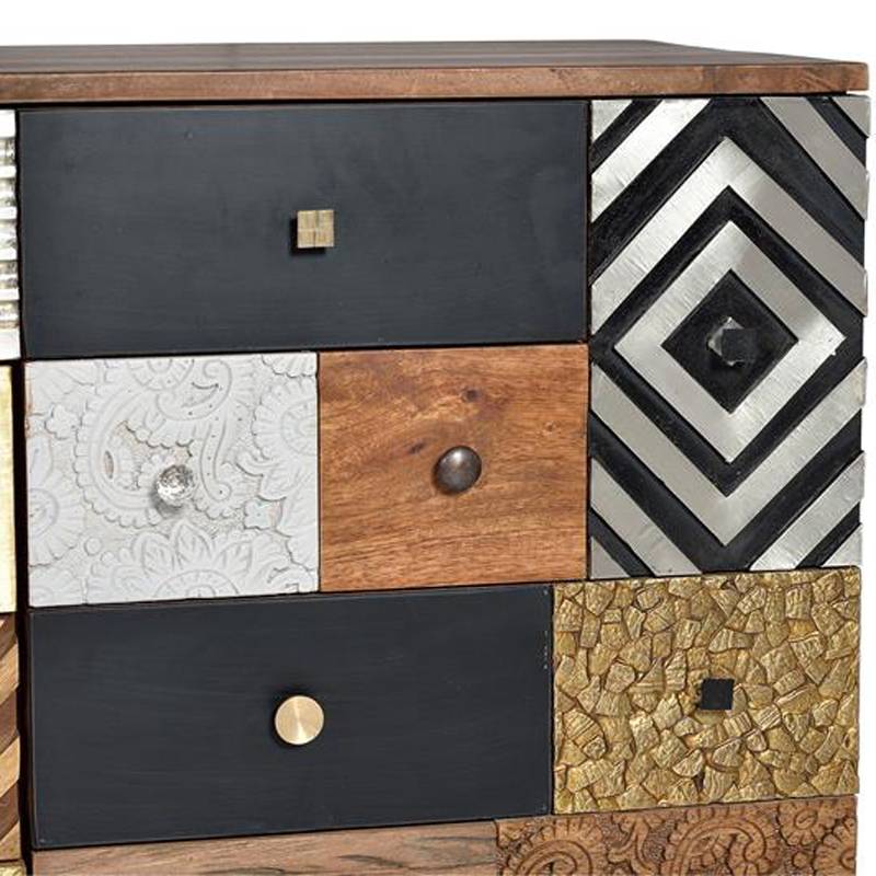 El aparador Mumbai esta fabricado con madera maciza de mango con frentes decorados con diversos materiales y colores. La madera de mango es una elección popular para muebles debido a su resistencia y durabilidad, además de su belleza natural. Es un tipo de madera sólida y duradera que proviene de un árbol tropical y es conocida por su belleza natural y su patrón de grano distintivo.