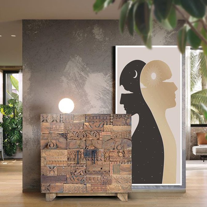 Aparador Roma pequeño, presentamos el precioso aparador de estilo rústico que seguro transformará cualquier habitación en la que se coloque. Fabricado a mano con madera maciza de mango, otras maderas recicladas y tiradores de metal, este aparador está diseñado prestando atención a los detalles y a las tallas decorativas.