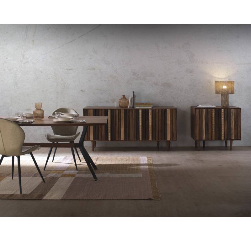 Esta composición está fabricada en madera maciza de acacia en acabado multicolor, combinando tonos nogal y natural. Su estructura de madera natural envejecida resalta el carácter orgánico del material. Está diseñada para interiores, especialmente para comedor y salón, y no requiere montaje.