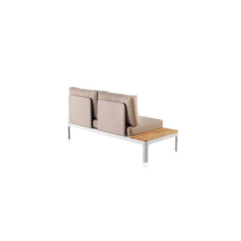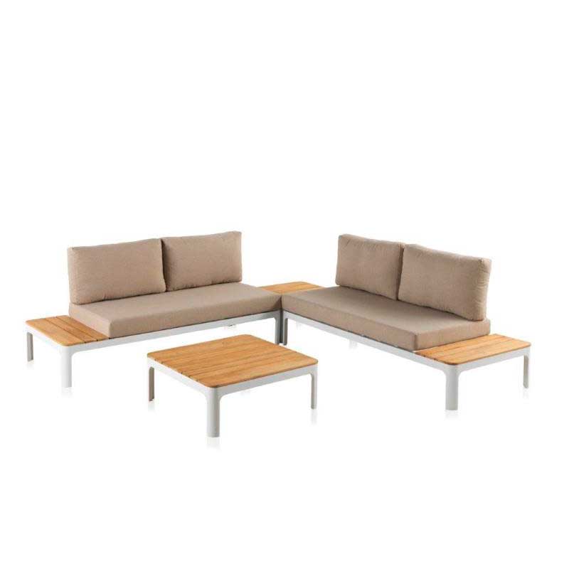 Consta de 2 sofás de 2 plazas con terminal de madera y 2 mesas de centro, fabricado con aluminio, estructura de 1,5 mm de espesor lacado blanco al horno a 200º.