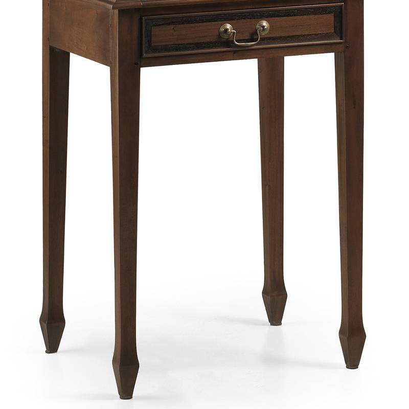 Consta de varios cajones y huecos. Estructura de madera maciza de caoba, barnizado con lacas naturales, accesorios metálicos en color bronce envejecido.