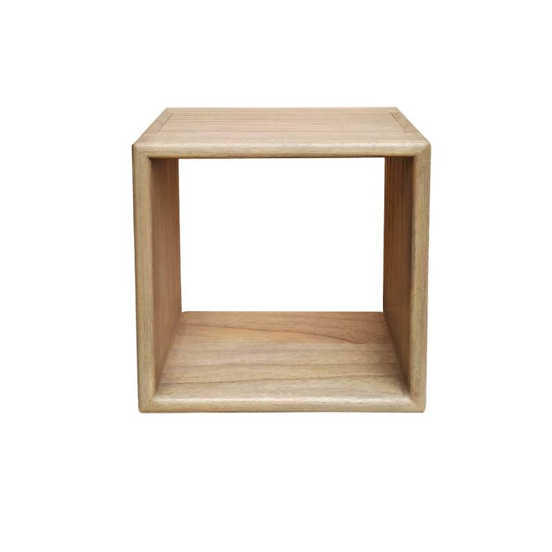 Estante en forma de cubo, fabricado en madera de mindi maciza.