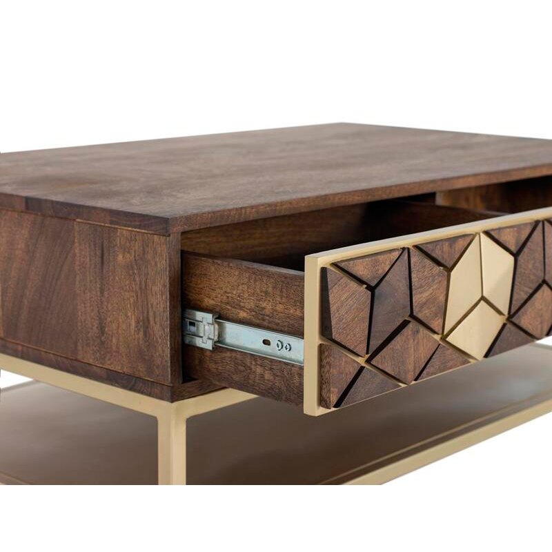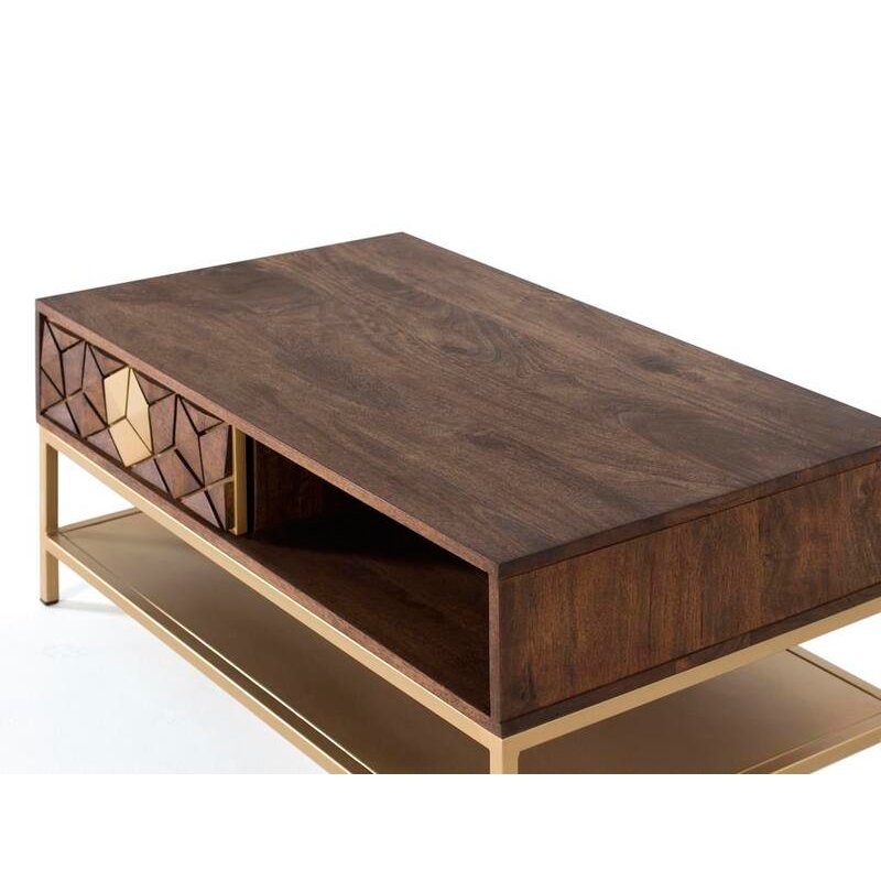 El mango de metal dorado no solo agrega un toque de lujo y distinción, sino que también facilita la apertura de los compartimentos de almacenamiento, brindando comodidad y funcionalidad. Esta mesa de centro no solo es un mueble, es una obra de arte que combina estilo y practicidad.