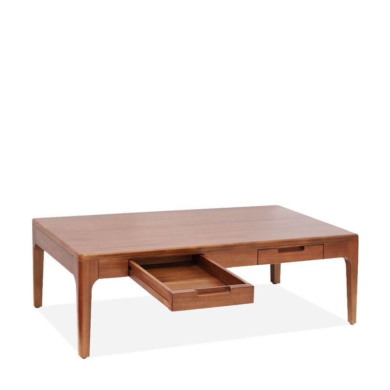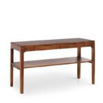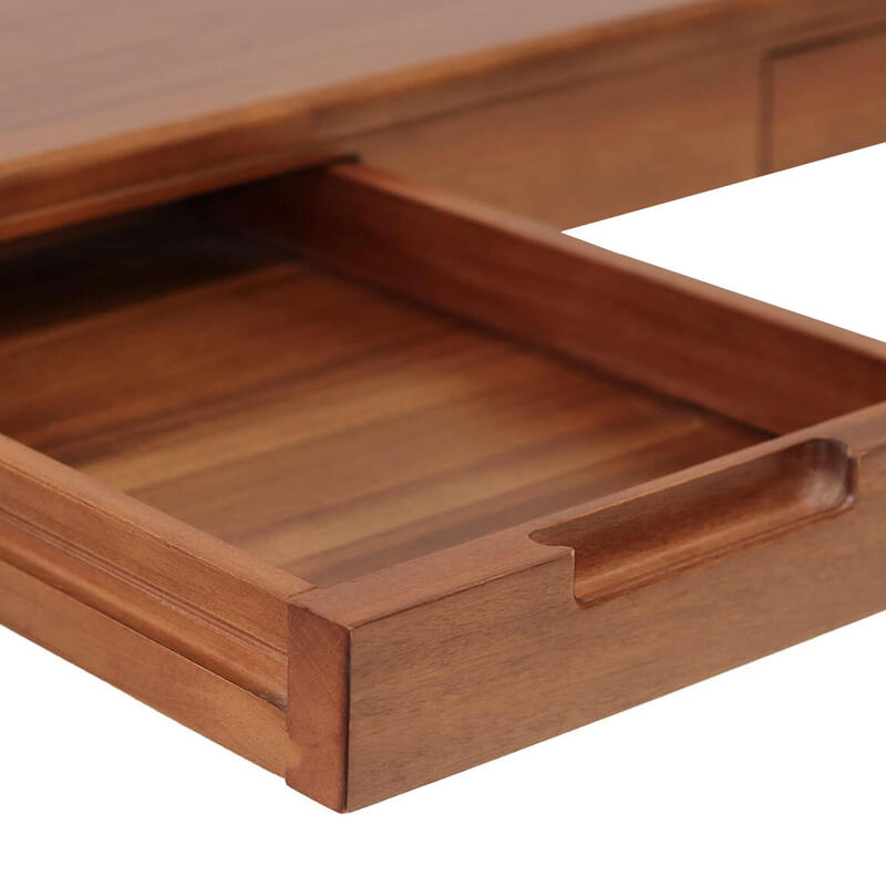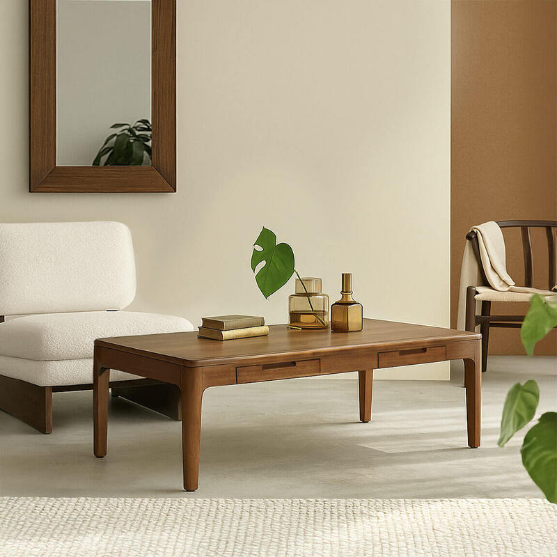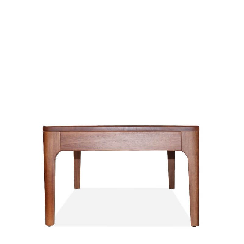 Mesa fabricada artesanalmente en madera de caoba, esta mesa de centro de la colección Oporto destaca por sus líneas finas y elegantes, con bordes suavemente redondeados. Dispone de dos cajones con sistema de apertura mediante una hendidura integrada en el cajón, sin tiradores visibles, lo que refuerza una estética limpia y minimalista. Requiere montaje de las patas.