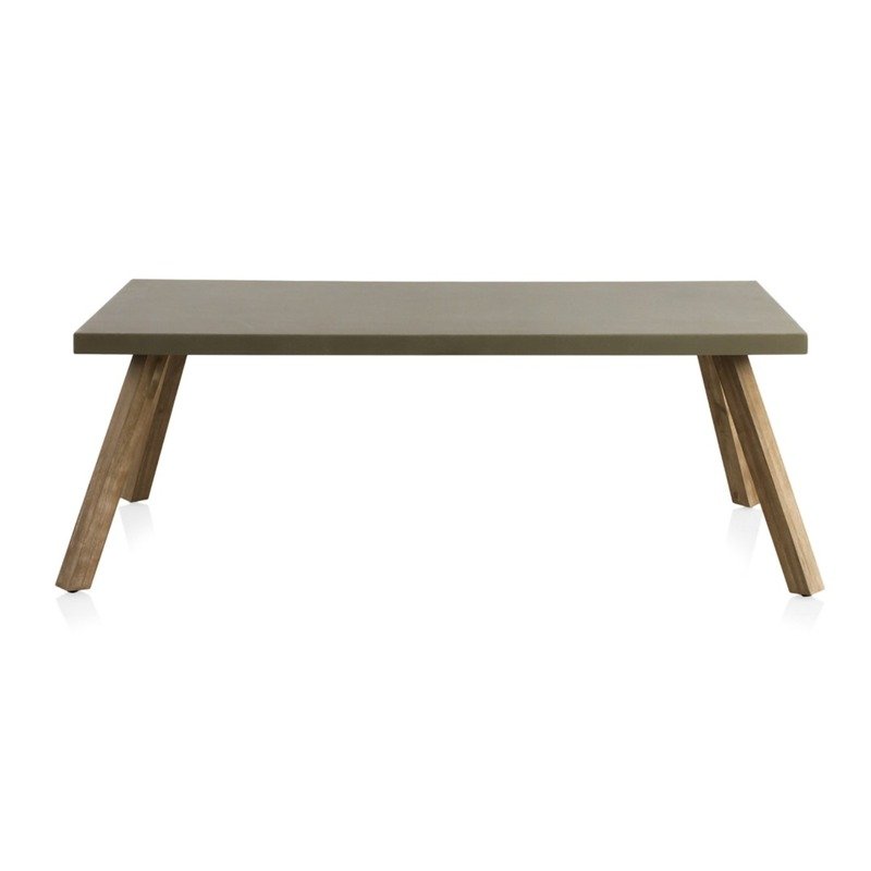 Estructura de las patas fabricada con madera maciza de acacia acabada con una ligera pátina grisácea, tablero de cemento ligero acabado en color topo grisáceo.