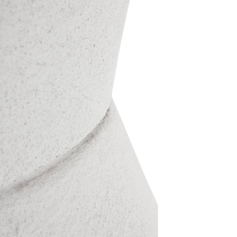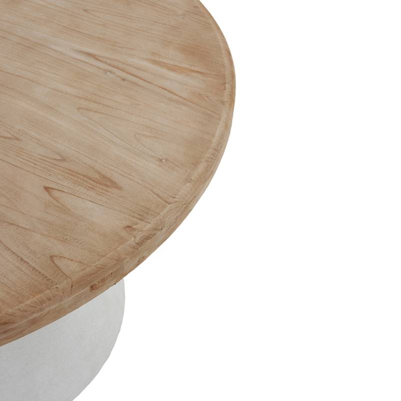 Mesa redonda con un original pie fabricado en poliresina acabado en color cemento blanco y tapa de madera de abeto de 4.5 centímetros de grosor en color natural.