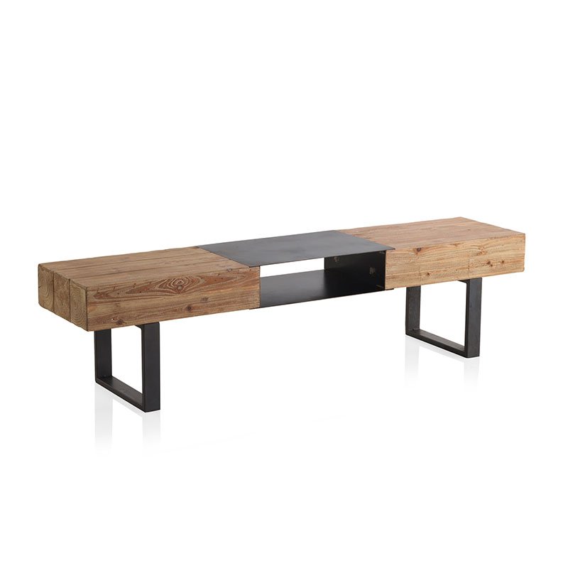 Mesa de televisión, con 2 patas laterales fabricada en hierro color negro y tapa de madera de abeto, con un original diseño en forma de vigas.