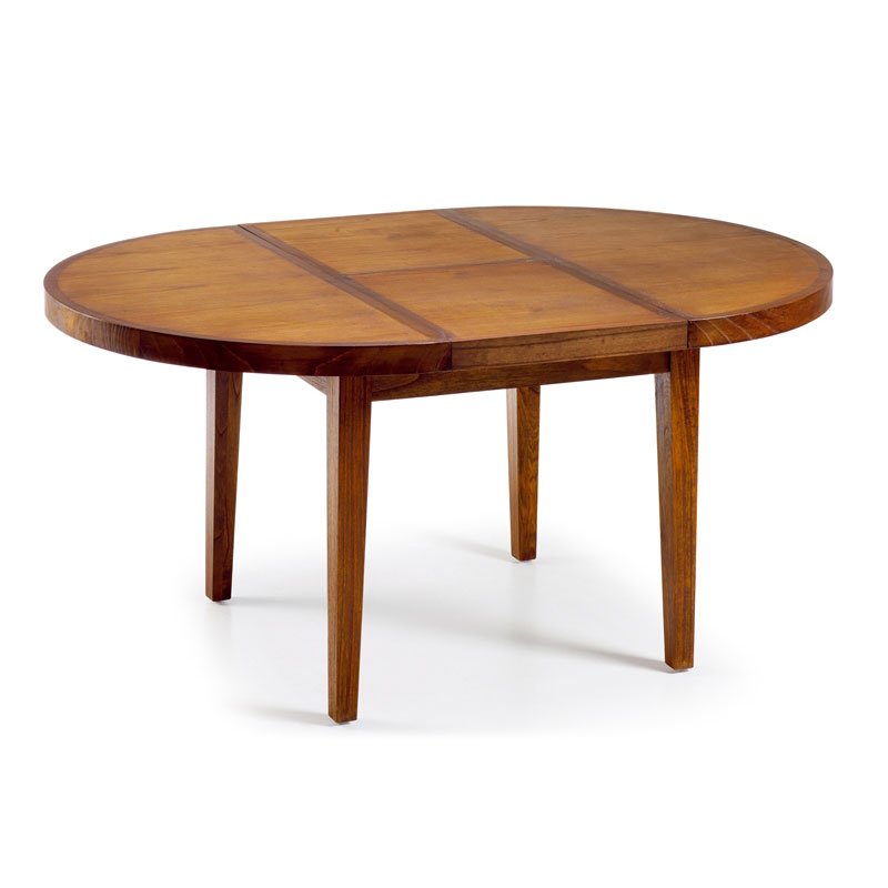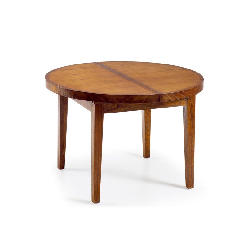 Mesa de comedor redonda extensible, fabricada artesanalmente con madera maciza de mindi.