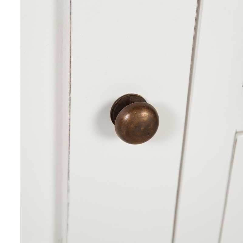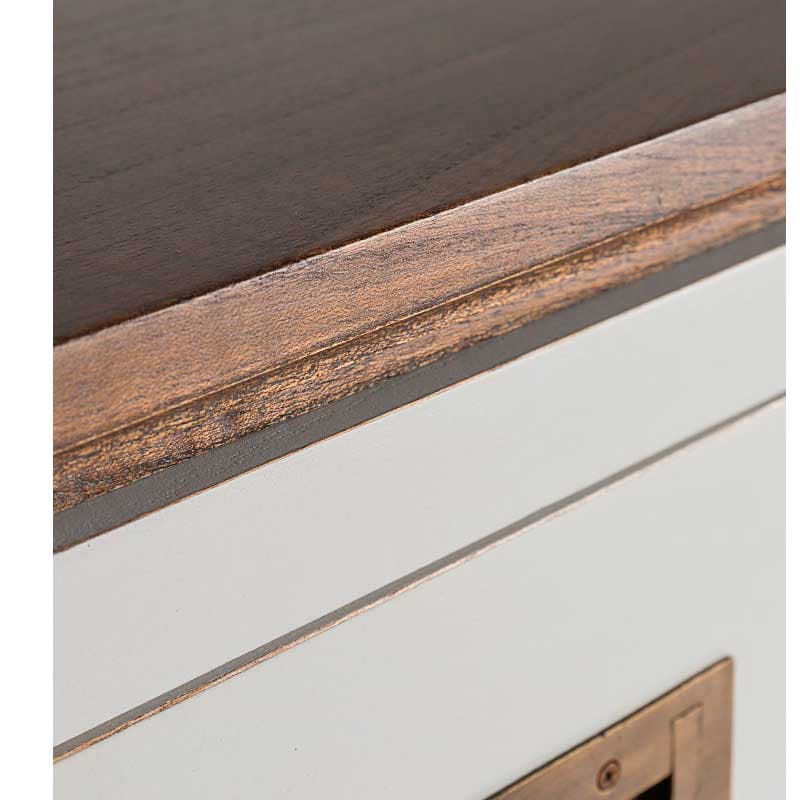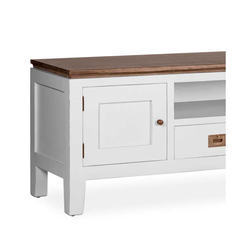 Mesa de televisión, fabricada artesanalmente en madera maciza de mindi, acabados de color en blanco y nogal combinados.