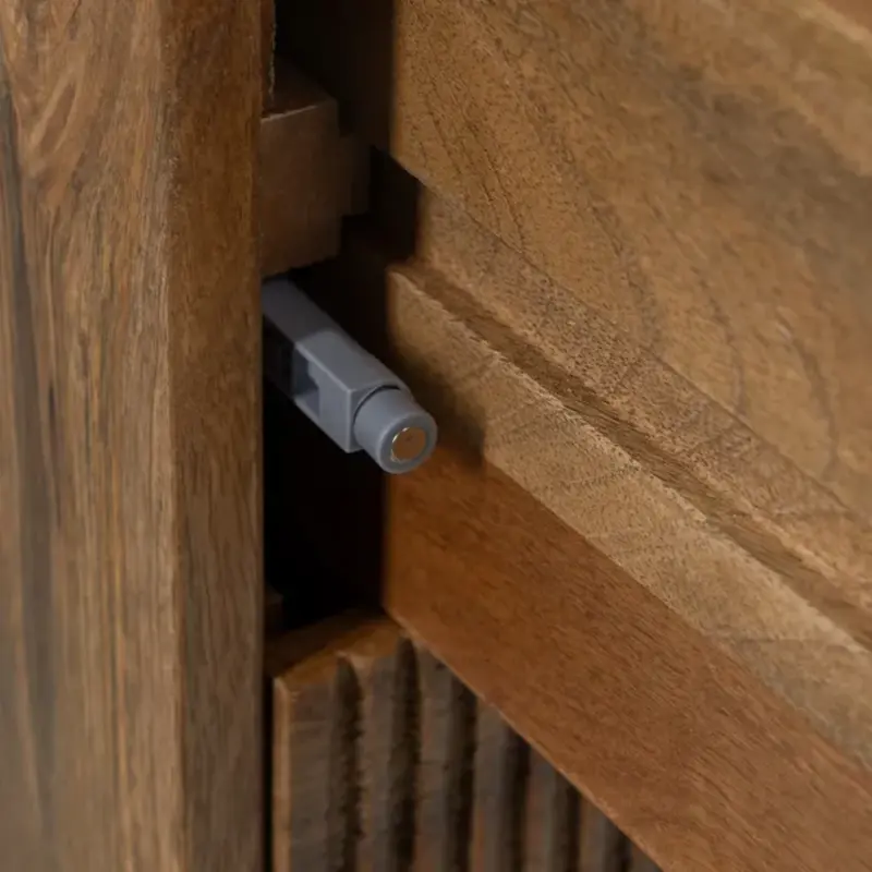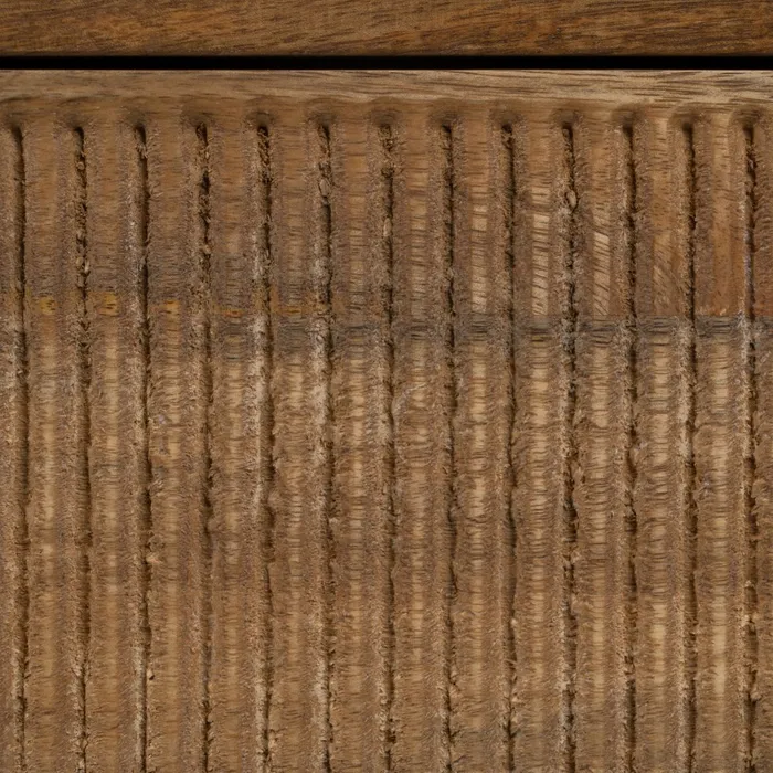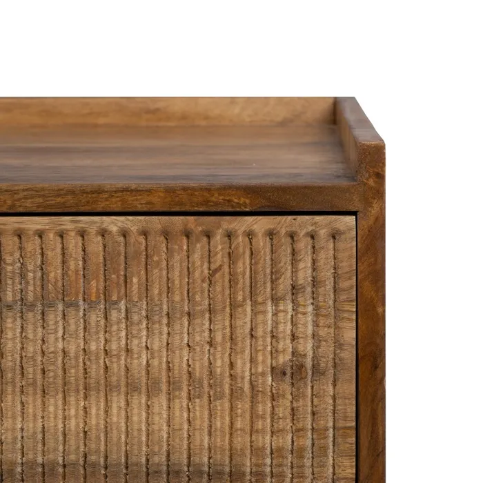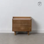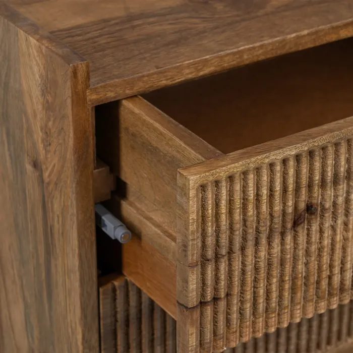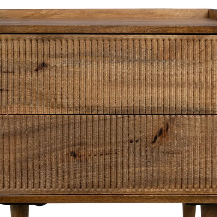 Mesita fabricada en madera de mango macizo, trasera e interiores de los cajones en DM. Este tipo de mueble es funcional, elegante y busca una conexión con materiales naturales, manteniéndose atemporal y versátil para distintos tipos de interiores. Diseño y estilo para tu hogar. Cuenta con dos cajones, frentes con original diseño y patas cónicas.