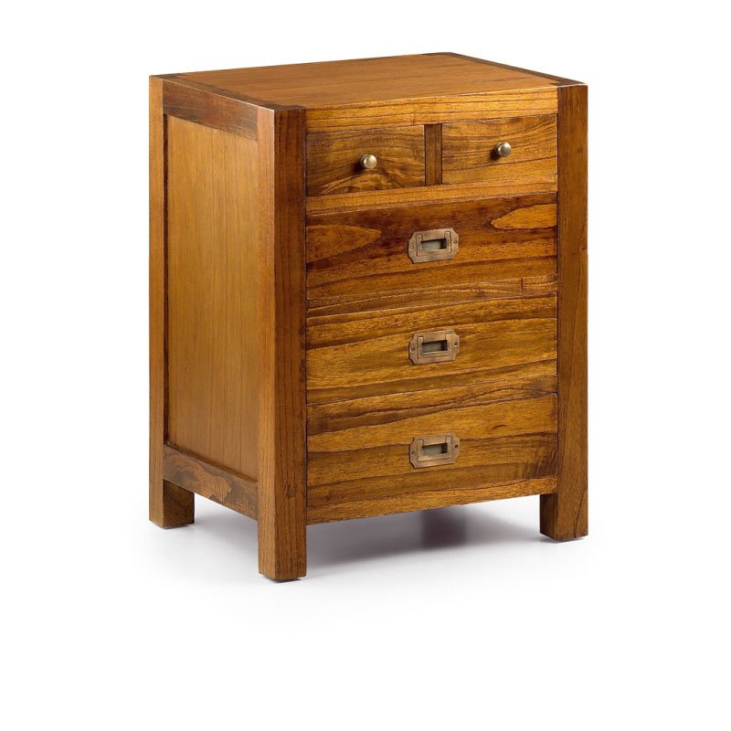 Mesita de noche, fabricada artesanalmente con madera maciza de mindi, consta de 2 cajones pequeños superiores y 3 grandes.