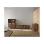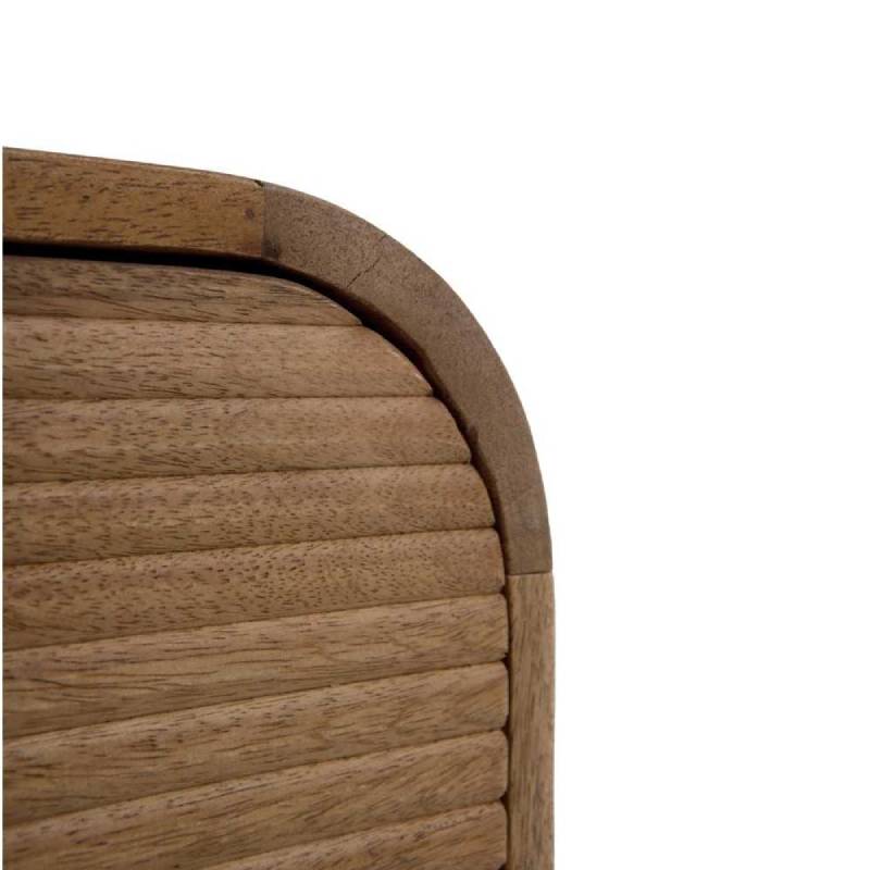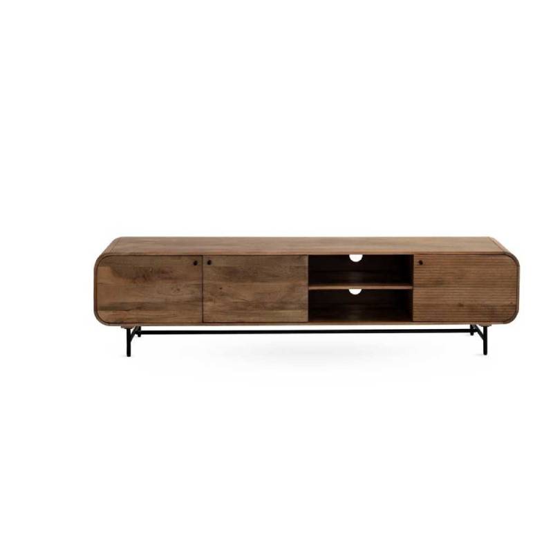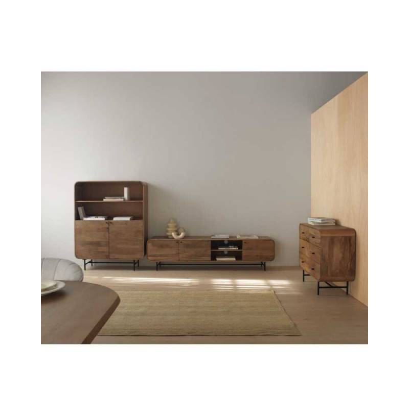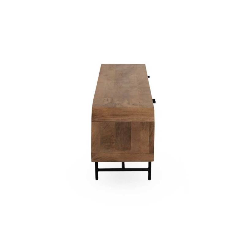 Mueble televisión con un original y atrevido diseño en forma cuadrada con contornos curvos, fabricado en madera de mango macizo en tono natural. Tiradores de puertas metálicos en color negro y forma cilíndrica, bisagras con cierre suave. Consta de dos puertas laterales, hueco intermedio y puerta lateral sin balda interna. Medida interna puertas laterales dobles: 98x36x32 h, y la medida de la puerta lateral derecha 47x36x32 h. Medida huecos centrales 50x36x15 h, con agujeros pasacables en la parte trasera.