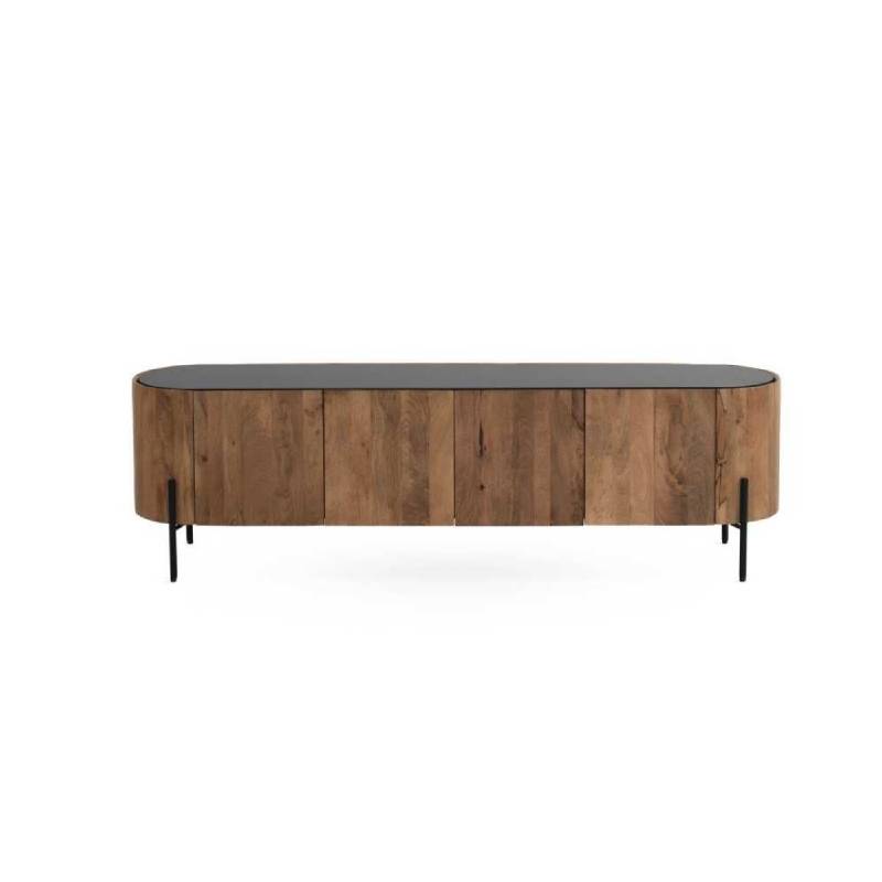 Mueble Tv fabricado en madera de mango maciza en tono natural y tapa encimera en color negro, con un diseño que no te dejará indiferente, ideal para ambientes modernos y sofisticados. Consta de 4 puertas sin balda interior, hueco cada bloque de 2 puertas 70x36x31h. Patas metálicas en color negro a 15 cms de altura.