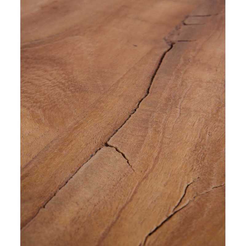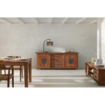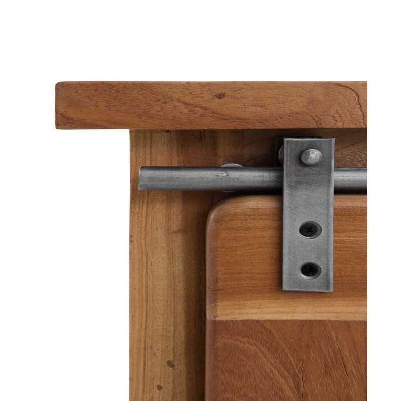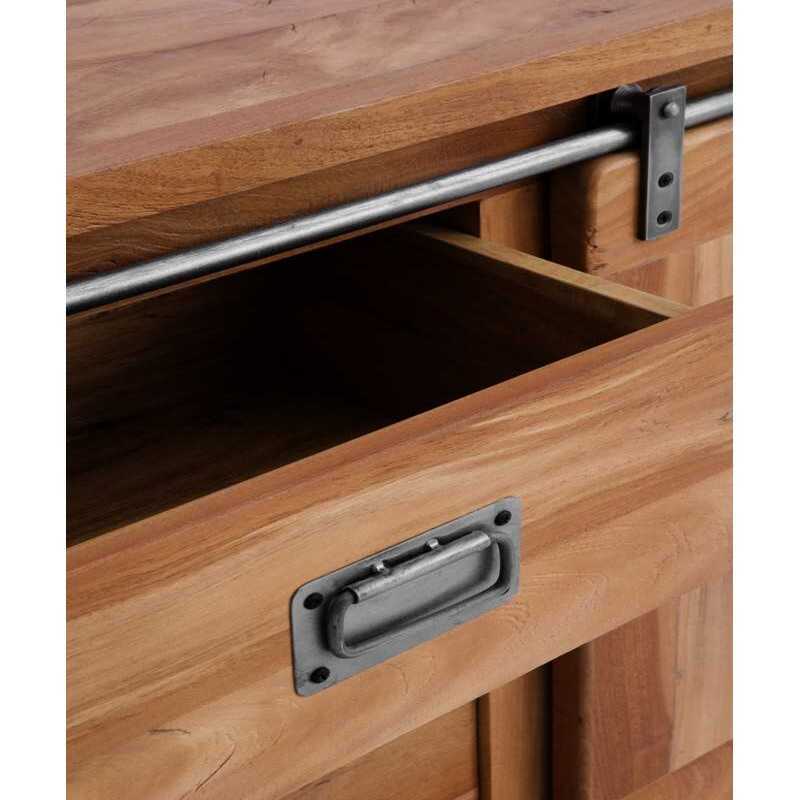 Mueble de televisión fabricada en madera maciza de acacia reciclada, superficie con grietas y nudos propios de la madera natural. Cuenta con una puerta corredera de madera maciza y herraje metálico en color gris oscuro, tras cada sección hay un estante interno fijo a media altura. A la derecha cuenta con dos cajones con medida interna de 39x30x9h, guias de madera y tiradores metálicos.