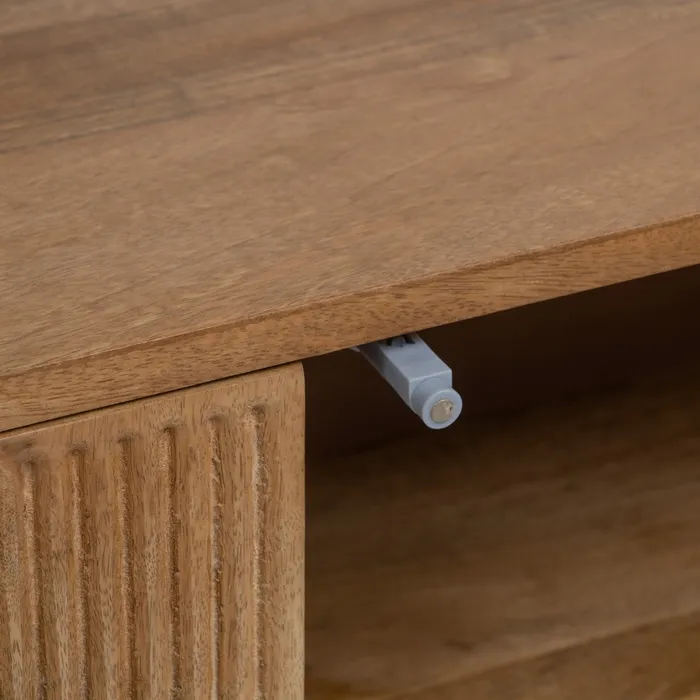 Mueble Tv fabricado en madera de mango macizo, trasera e interiores de los cajones en DM. Este tipo de mueble es funcional, elegante y busca una conexión con materiales naturales, manteniéndose atemporal y versátil para distintos tipos de interiores. Diseño y estilo para tu hogar. Cuenta con cuatro puertas y dos huecos, frentes de puertas con original diseño y patas cónicas.