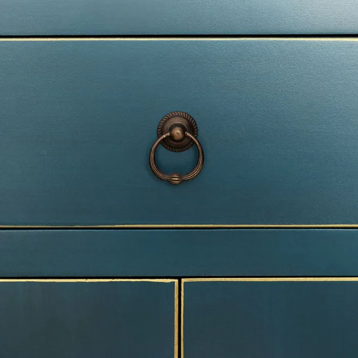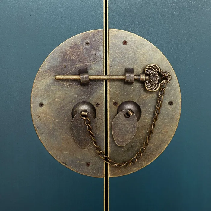 Mueble de estilo oriental, fabricado de DM , definen su estilo los herrajes dorados con formas tradicionales y un broche circular central, característicos del mobiliario chino antiguo. Líneas rectas y limpias, típicas del diseño asiático minimalista. Acabado en laca azul, un color que aunque moderno, respeta la tradición de muebles lacados asiáticos. Simetría en la distribución de cajones y puertas, ocho cajones y dos puertas, le dotan de armonía visual.