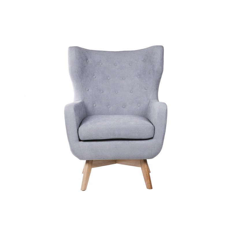 Sillón tapizado en color gris light con patas de madera ligeramente inclinadas acabadas en color natural.